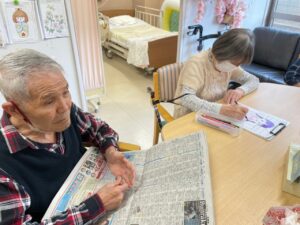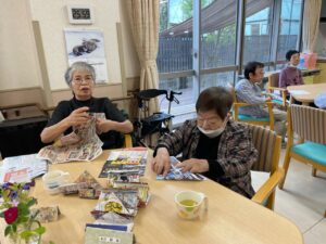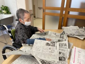 塗り絵、新聞購読、ごみ入れ作り、新聞たたみのお手伝い、、、(*^-^*)